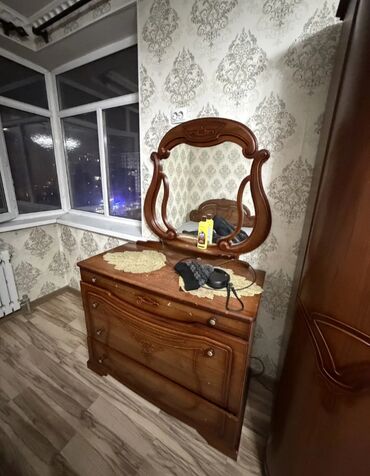 - Комод с 3 глубокими выдвижными ящиками, сверху трюмо/зеркало в фигурной раме. Столешница широкая для косметики и аксессуаров.