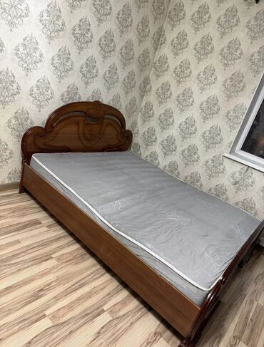 - Кровать односпальная с изголовьем фигурной формы, в комплекте, судя по фото, матрас стандартного размера. Боковины и изножье в едином стиле с резьбой.