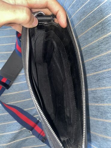 - Ремень: широкий текстильный, регулируемый, с фирменными полосами темно‑синего и красного цветов и кожаной накладкой на плечо; карабины и полукольца из металла