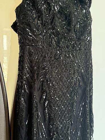 Вечернее платье черного цвета с пайетками и длинными рукавами. - Верх: плотный материал, полностью расшит черными пайетками, круглый вырез, длинные рукава. - Низ: многослойная струящаяся юбка в по...