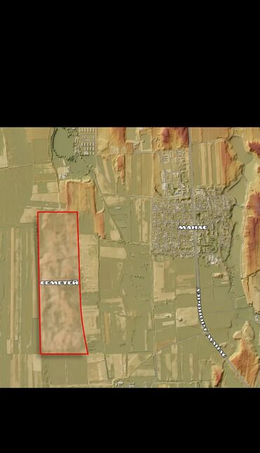Продаётся земельный участок с оформленным государственным актом о праве частной собственности (красный сертификат). На карте обозначен массив «Семетей», рядом с пос. Манас и недалеко от трассы, ведущей к аэропорту Манас.