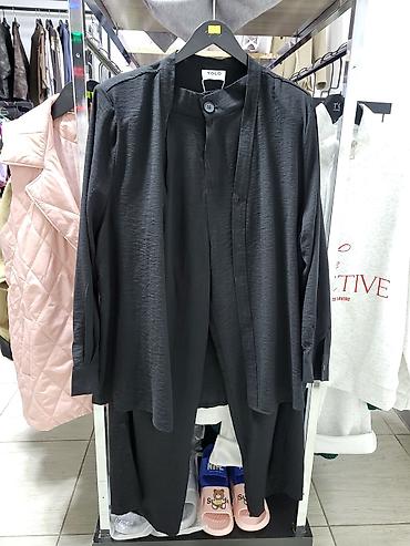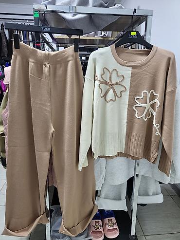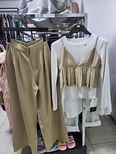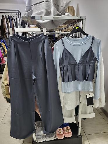 - Ткань брюк и топа — плотная костюмная с лёгким матовым блеском; лонгслив — мягкий трикотаж.