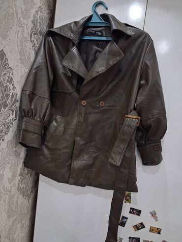 1) Плащ-тренч из эко-кожи, оливково‑коричневый