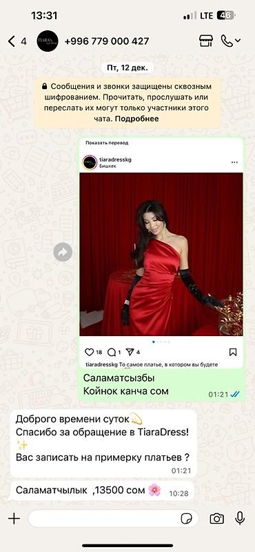 Цена: 13 500 сом (указана на скриншоте переписки TiaraDress)