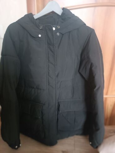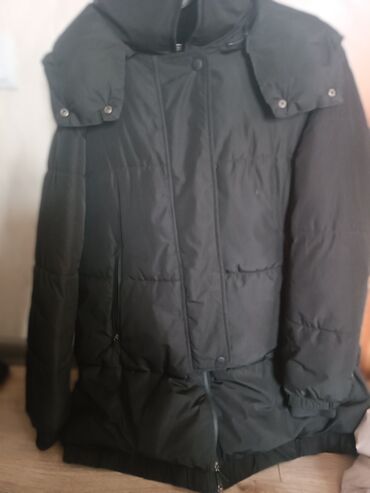 2) Черная куртка средней длины с капюшоном, двумя объемными карманами с клапанами.