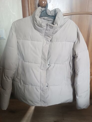 3) Светло-бежевый пуховик с высоким воротником-стойкой, горизонтальная стежка, боковые карманы.