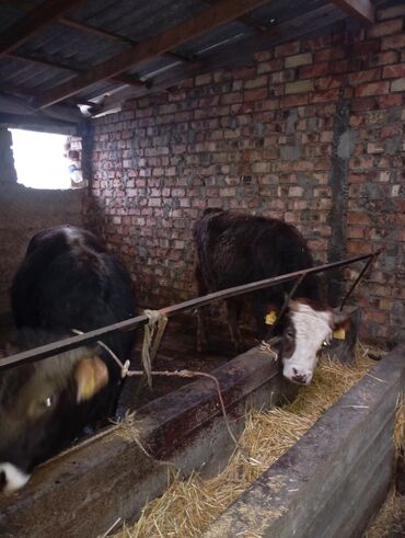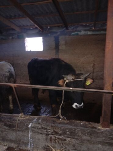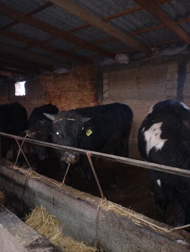 Бык-производитель, чёрно-пёстрый окрас. Крупный, сильный, с широкой грудью и хорошо развитыми мышцами. Содержится в крытом загоне, на привязи, с кормушкой для сена. На фото — реальное животное, спо...
