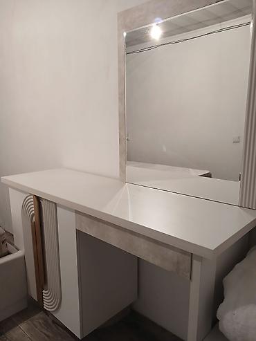 - Туалетный стол с большим вертикальным зеркалом. Широкая столешница, выдвижной центральный ящик, тумба с распашной дверцей. Фасады с фигурными 3D-накладками и золотистыми ручками.