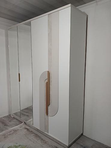 Спальный гарнитур в современном стиле, цвет – белый/молочный с декоративными вставками под золото и зеркальными элементами.