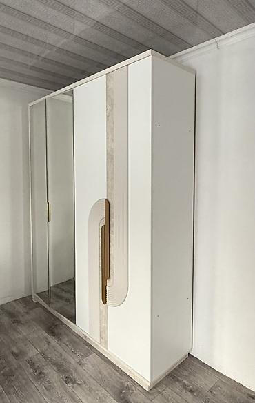 - Шкаф-купе с одной зеркальной дверью и второй глухой дверью с рельефным 3D-декором и вертикальной ручкой под золото.