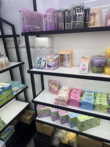 Витрина и стеллажи для магазина косметики/аксессуаров Комплект торгового оборудования в современном стиле: - Прямая стеклянная витрина-прилавок на колесах: указаны габариты на фото — длина около 3...