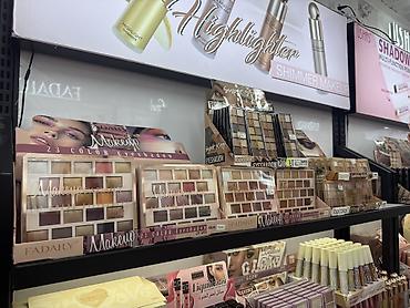 - Боковые панели островных модулей с яркими тематическими постерами (косметика/уход) — визуальный мерчандайзинг и навигация.