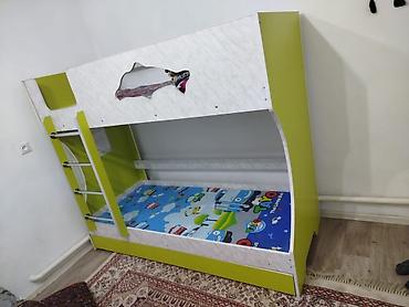 Детская двухъярусная кровать. - Материал: ЛДСП/МДФ (визуально — светло‑зелёный цвет). - Два спальных места стандартного детского/подросткового размера (см. фото матрасных оснований). - Прямая верт...