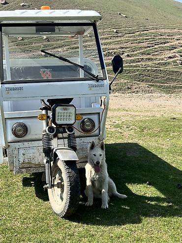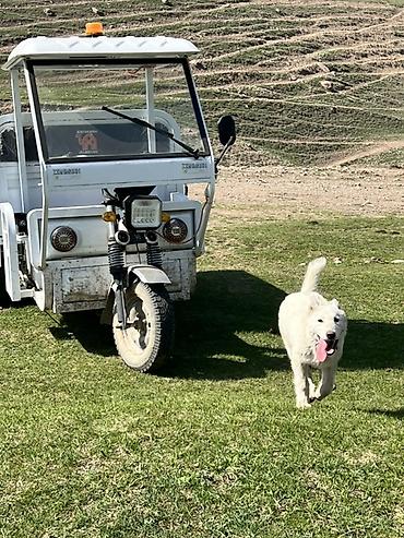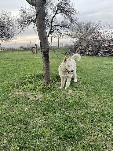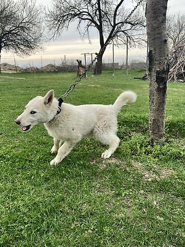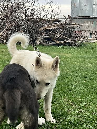 Щенок белого окраса, активный и выносливый. Прямые уши, густая двойная шерсть, пушистый хвост, крепкий костяк. На фото видно уверенное поведение, хороший темперамент, любознательность и контактность. Подходит для загородного содержания, охраны двора и как компаньон для активных прогулок. Любит бегать рядом с техникой и людьми, легко мотивируется игрой и вниманием.