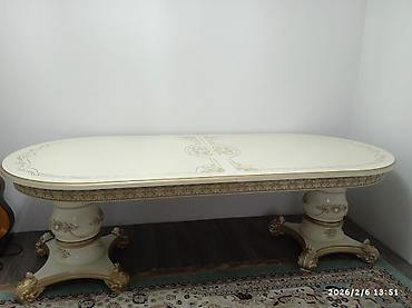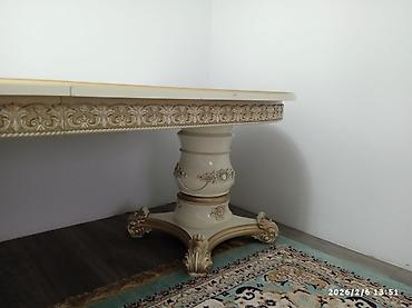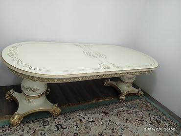 - Цвет и отделка: молочно‑кремовый с золотистыми акцентами и резным орнаментом по царге; художественная инкрустация/роспись на столешнице.