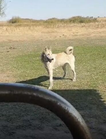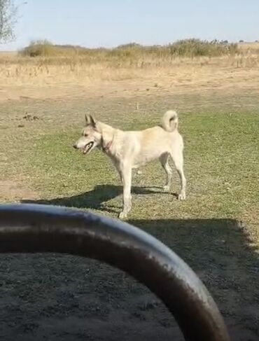 Собака среднего размера, светло-палевого окраса с серыми отметинами на морде и ушах. Стоит на длинных ногах, сухого, athletic сложения. Хвост плотный, закручен кольцом вверх. Уши стоячие, морда клинообразная. На шее — ошейник.
