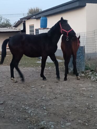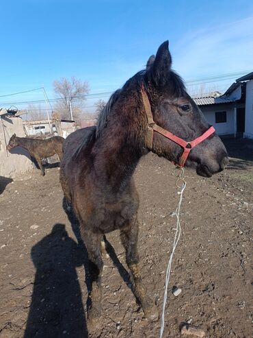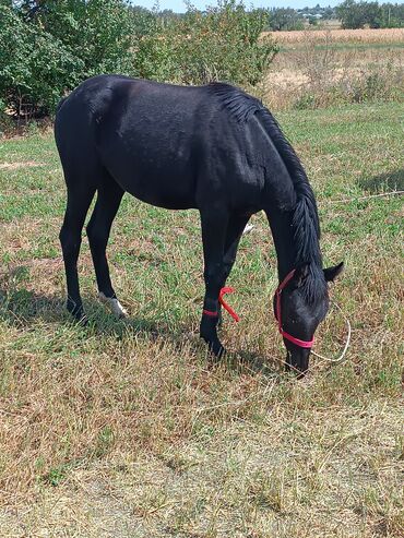 Лошадь, масть ворона. На фото — статная кобыла/мерин молодого типа с выразительной головой и правильными пропорциями корпуса. Носит красный недоуздок, спокойно стоит на привязи, уверенно перемещается по двору и пастбищу. Хорошо пасётся, не пуглива, контактная, позволяет себя вести на поводу. Подойдёт для хозяйственных целей, дальнейшей выездки, прогулок и пастьбы.