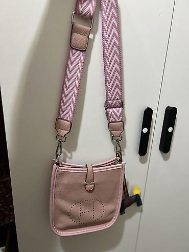 - Ремень: широкий текстильный, розово‑белый с ёлочным узором, регулируемый по длине, на карабинах (съемный).