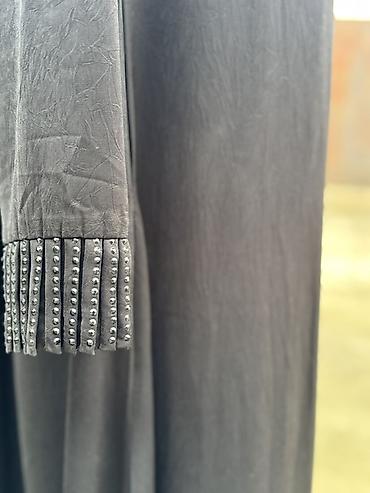 - Свободный А‑силуэт до пола, мягко струящаяся ткань.