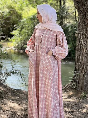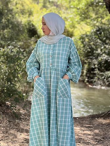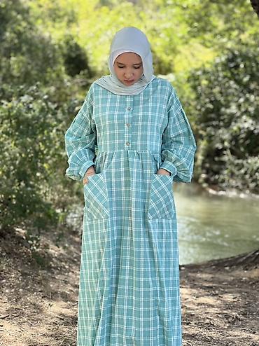 Платье в клетку макси с карманами - Свободный силуэт с высокой линией