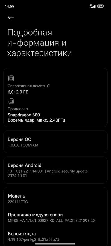 - ОС: Xiaomi HyperOS 1.0.8.0 (на базе Android 13), актуальный патч безопасности 2024-10-01