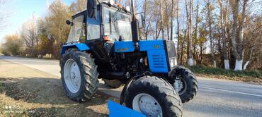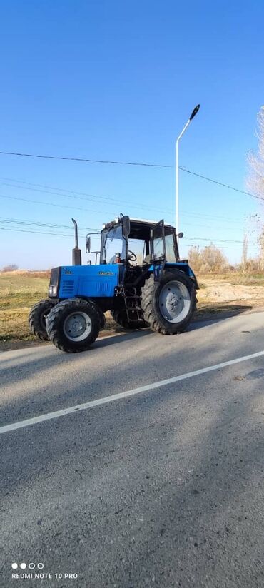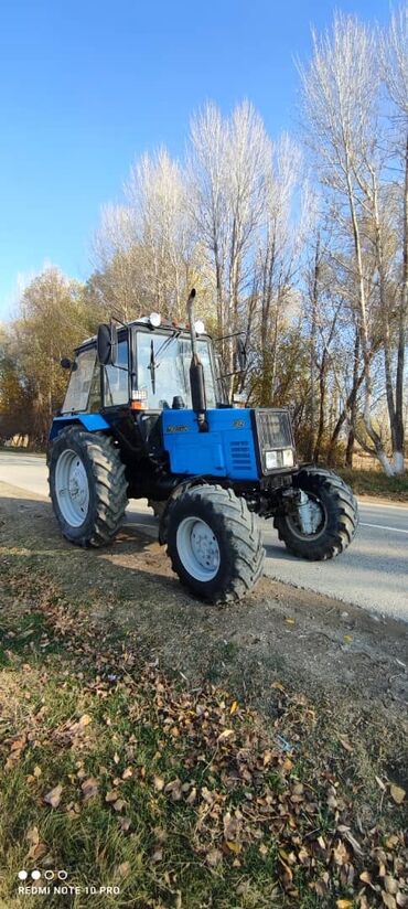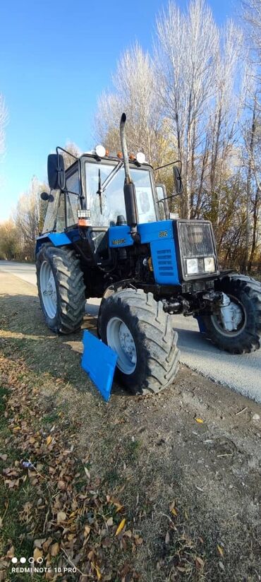 Трактор Беларус (МТЗ) 892, полно-приводный (4x4), кабина с остеклением и рабочими фарами на крыше. Синий капот, вертикальный выхлоп, передняя решётка с двумя фарами, боковые жалюзи для охлаждения. Широкие задние колёса с грунтозацепами, усиленные передние шины для работы на бездорожье. Навеска задняя трехточечная, передняя балка с приводом моста. Кабина оборудована зеркалами, дворниками, боковыми поворотниками, лестницей для удобной посадки, задним стеклом с открыванием. В комплекте видна синяя боковая панель/кожух. Подходит для пахоты, посева, культивации, транспортных и коммунальных работ. Надёжная и распространённая модель с доступностью запчастей и навесного оборудования.