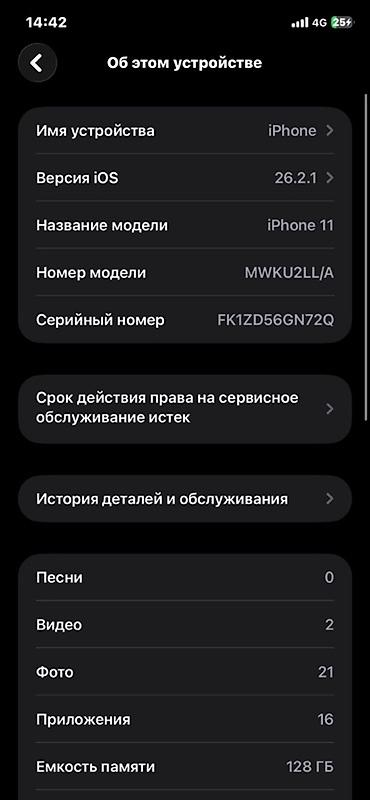 IPhone 11, 64 ГБ, чёрный Характеристики и детали по фото: - Модель: iPhone 11 (номер модели MHDA3RU/A) - Память: 64 ГБ, доступно ~31,96 ГБ - iOS: 18.7.2 - Связь: поддержка сотовой сети, Wi‑Fi (адр...