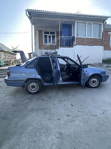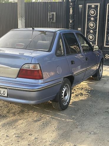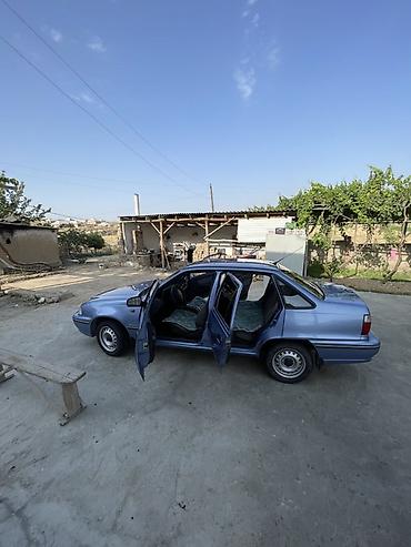 Седан Daewoo Nexia, цвет светло-голубой (металлик). Кузов 4-дверный, передний привод. Легкосплавные/штампованные диски 13–14", заводские колпаки, шины дорожного типа. На крышке багажника эмблема DOHC. Компоновка салона на 5 мест, тканевая обивка, передние и задние подголовники, раздельные спинки, карманы в дверях. Руль классический трехспицевый, центральная консоль с нишей/магнитолой, вентиляционные дефлекторы, прикуриватель/розетка. Задние стекла тонированы.