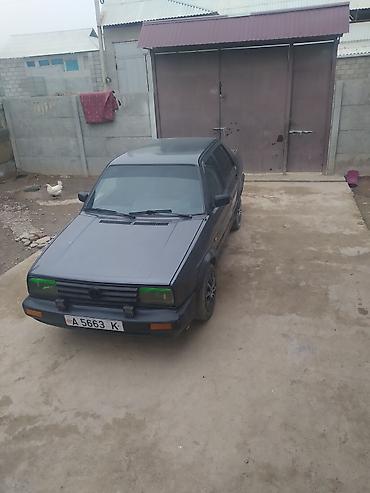 Volkswagen Jetta (седан, ориентировочно поколение Mk2). Серый цвет кузова. Компактный городской автомобиль с классическим угловатым дизайном.