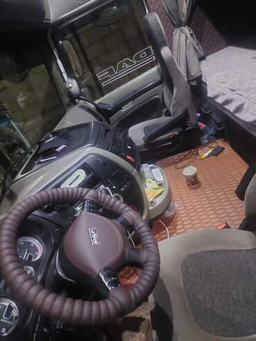 - Эргономичное рабочее место водителя: мультируль DAF с кожаной оплёткой, круиз-контроль/кнопки на руле, центральная консоль с органами управления, бортовые приборы с тахометром, розетки/USB для зарядки, подстаканники и ниши для мелочей.