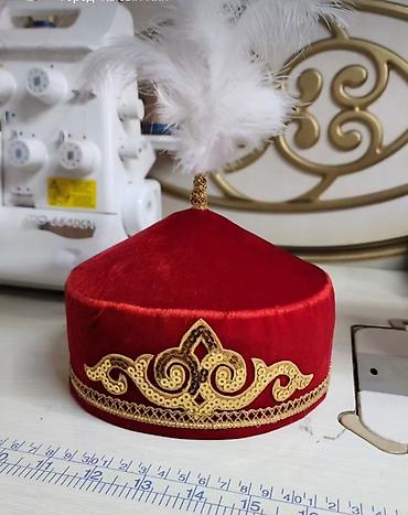 Традиционный детский головной убор с пером (национальный стиль). - Форма: коническая шапочка. - Материал верха: бархатистая ткань насыщенного красного цвета. - Декор: широкий орнаментальный кант и...