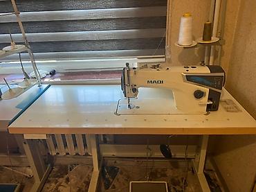 - Прямострочная промышленная машина MADI на столе с мерной разметкой, нижним транспортером, позиционером иглы, коленоподъёмником/рычагом подъёма лапки и педальным управлением. На держателе установлены катушки нитей.