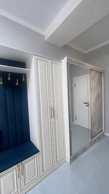 - Прихожая: модуль хранения с мягкой бархатистой синим велюровой скамьей и спинкой, тумбами и высокими шкафами, фурнитура под золото; шкаф‑купе с зеркальной дверью и порталом под камень.