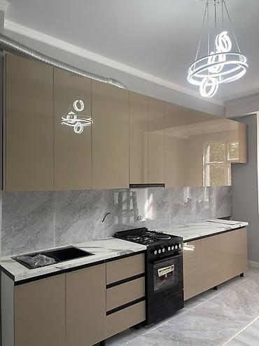- Кухонный гарнитур: глянцевые фасады в бежево‑тауповом оттенке, длинная линейная планировка, верхние шкафы до потолка, интегрированные черные ручки, столешница и фартук под мрамор, врезная мойка, место под варочную панель/духовой шкаф, вытяжной канал.