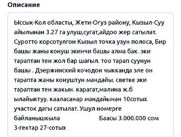 Продается земельный участок площадью 15 соток, расположенный в Иссык Кул Оргочор - На участке посажено около 70 молодых яблонь - Имеется государственный акт о праве частной собственности на земел...