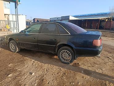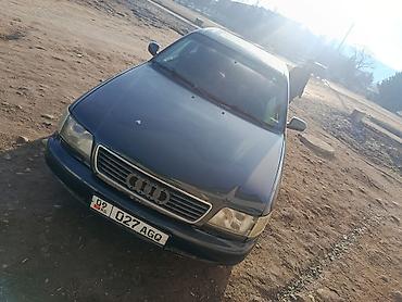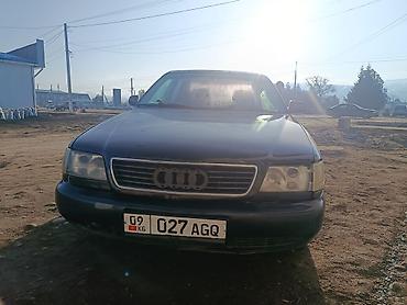 Audi A6 (C4) седан, темно‑зеленый/черный цвет кузова. Полноразмерный салон с темной отделкой, вставки под дерево. Тканевые чехлы на передних и заднем сиденьях, подголовники в тех же чехлах. Задний диван широкий, предусмотрены крепления ремней безопасности; на полу — резиновые коврики. Передняя панель с фирменной приборной комбинацией Audi, трехспицевый руль, центральная консоль с штатными органами управления. Электропакет на дверях водителя (кнопки стеклоподъемников), карманы в дверях. Задние дефлекторы обдува и туннель между сиденьями. Кузов с классической решеткой радиатора Audi и прямоугольной оптикой. Номерные знаки KG.