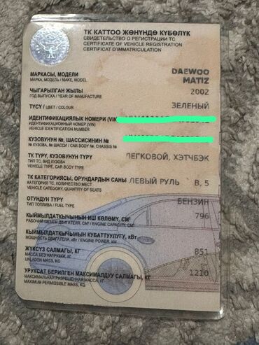 - Свидетельство о регистрации прилагается на фото: Daewoo Matiz 2002, зеленый, бензин, 5 мест, левый руль, VIN и номер кузова закрыты.