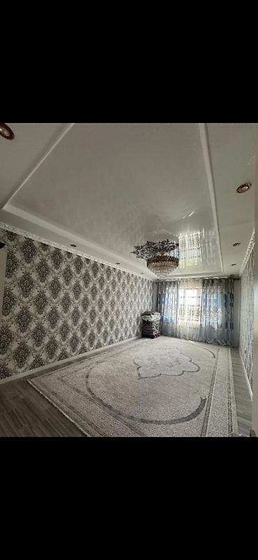 - Гостиная: большое помещение с панорамным ковром, декоративными обоями с орнаментом, натяжным глянцевым потолком по периметру с точечными светильниками и центральной хрустальной люстрой. Большое окно с двухслойными шторами (тюль + плотные портьеры) дает много света.