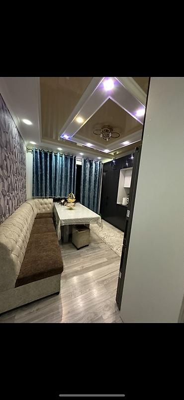 - Кухня-столовая/столовая зона: угловой мягкий диван по стене, обеденный стол прямоугольной формы с чехлом, пуф; стены с декоративными обоями, многоуровневый потолок со встроенной подсветкой и центральным светильником; шторы в тон интерьера. Напольное покрытие – светлый ламинат.
