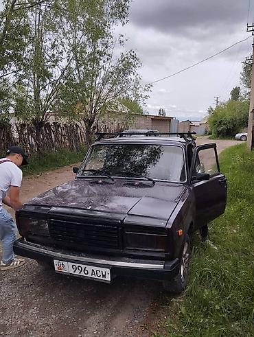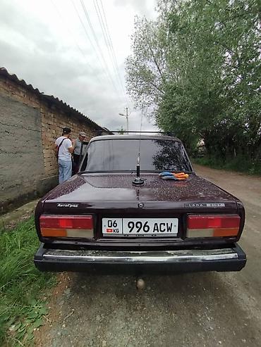 Лада 2107, седан, темно-бордовый цвет. Кузов классической формы с хромированными бамперами, черной решеткой радиатора и прямоугольной оптикой. На крыше установлен багажник-релинги. Сзади — значок LADA 2107, выведена антенна на крышке багажника, фаркоп. Номерные знаки KG.