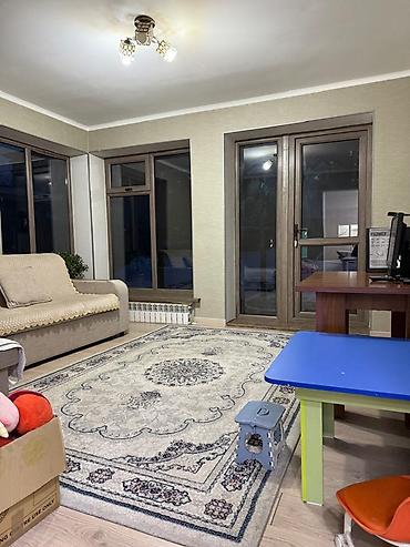 - Просторная гостиная с панорамными окнами, выходом на террасу/двор и большим ковром; диван, рабочий стол.