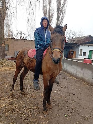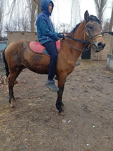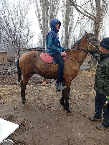 Срочно срочно жашы 3 жаш эркек малга улака универсал басыгы бар женил оозу жумшак Кеми бар ат ысык атада Лошадь под верховую езду - Масть: гнедая, с белой отметиной на морде и белой «чулочной» отм...