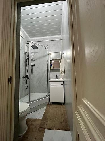 - Санузел совмещённый: душевой уголок с высоким поддоном и стеклянными створками, верхний тропический душ и ручная лейка, современная раковина‑тумба с зеркалом, унитаз. Отделка «под мрамор», потолок с панелями, точечное освещение.