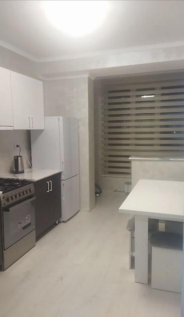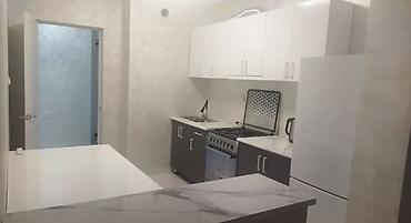 - Просторная кухня с линейным гарнитуром: верхние и нижние шкафы, столешницы под мрамор, фартук, мойка с высоким смесителем.