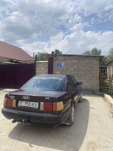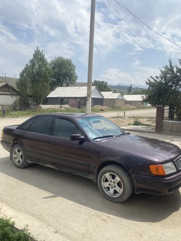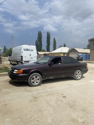 Audi 100 E, седан, темно-бордовый цвет. Двигатель 2.5 (указано на крышке багажника). Передний привод. Кузов C4 с классическим дизайном: длинный капот, широкие двери, просторный салон.