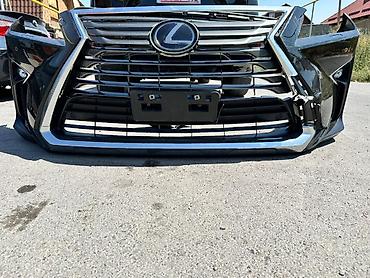 Передний бампер в сборе для Lexus LX (серия с фирменной решёткой Spindle Grille). Цвет – чёрный с хромированными элементами.