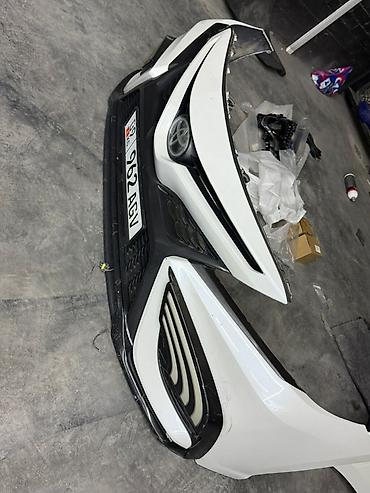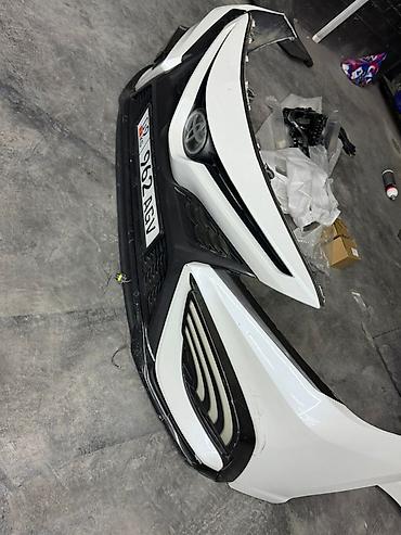 На фото показан установленный на автомобиле и снятый в сборе бампер с нижней губой и облицовками. Подходит для замены штатного узла или обновления внешнего вида. Проверяйте совместимость по форме решетки, фарам и геометрии.
