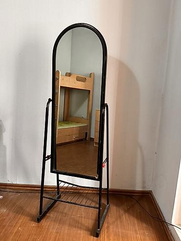 - Напольное зеркало на поворотной раме. Узкое, высокое, в черной металлической стойке с дугообразным верхом; снизу полка‑решетка для обуви/мелочей.