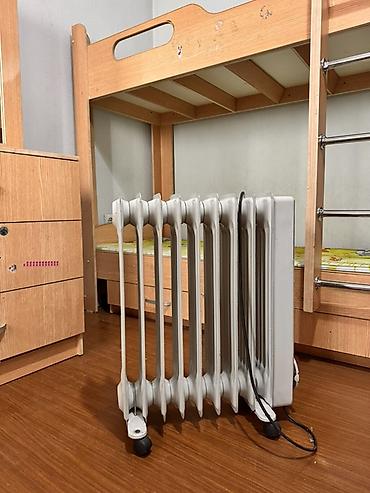 - Масляный электрический радиатор на колесиках, секционный, с кабелем питания и ручкой для перемещения.