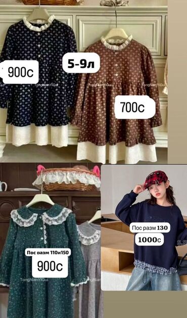 - Платья для девочек с мелким цветочным принтом, кружевным воротником/манжетами, застежка спереди. Подписи на фото: 5–9 л — 700 с; 900 с; «Пос разом 110 и 150» — 900 с.
